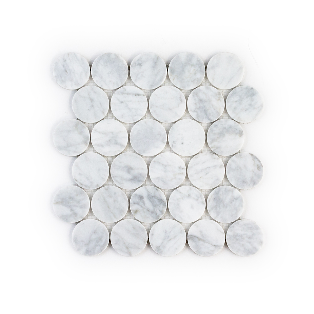 Introduce a touch of modern sophistication to your home with our Olympus Round 11-1/8 in x 11-1/8 in Mosaic. Crafted from premium Thassos marble, this mosaic features an extra-large penny round pattern that adds a unique and elegant flair to any space. The polished finish enhances the pure white beauty of Thassos marble, creating a lustrous and reflective surface that brightens and expands your interiors. Combine with other mosaics and field tiles to create impressive installations. For best installation results, use white polymer-modified thinset.